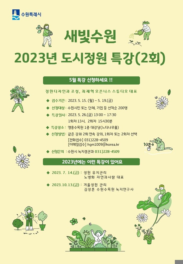 수원시가 ‘2023년 도시정원 특강’ 2차 강의 참여자를 5월 19일까지 모집한다.