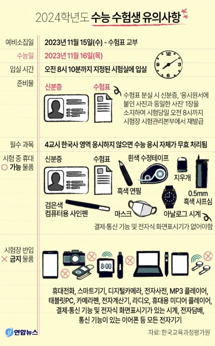 하지만 부득이하게 시험장에 가져갔을 경우에는 1교시 시작 전 감독관에게 반드시 제출해야 한다. 시험 중 휴대할 수 있는 물품은 신분증, 수험표, 검은색 컴퓨터용 사인펜, 흰색 수정테이프, 0.5mm 샤프심, 흑색 연필이라고 전했다.