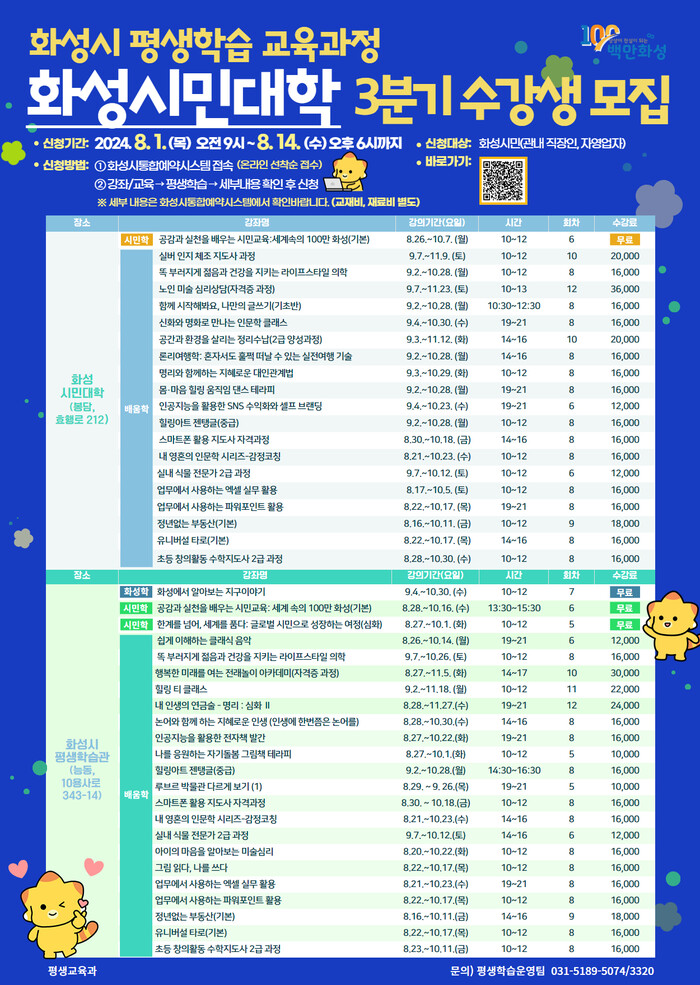 화성시(시장 정명근)가 다음달 1일부터 14일까지 화성시 평생학습 교육과정 화성시민대학 3분기 수강생을 선착순 모집한다고 29일 밝혔다.