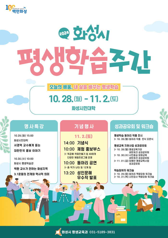화성시(시장 정명근)가 오는 28일부터 다음달 2일까지 화성시민대학과 화성시 평생학습관에서 ‘오늘의 배움, 내 삶을 바꾸는 평생학습’을 주제로 ‘2024 화성시 평생학습주간’을 운영한다.