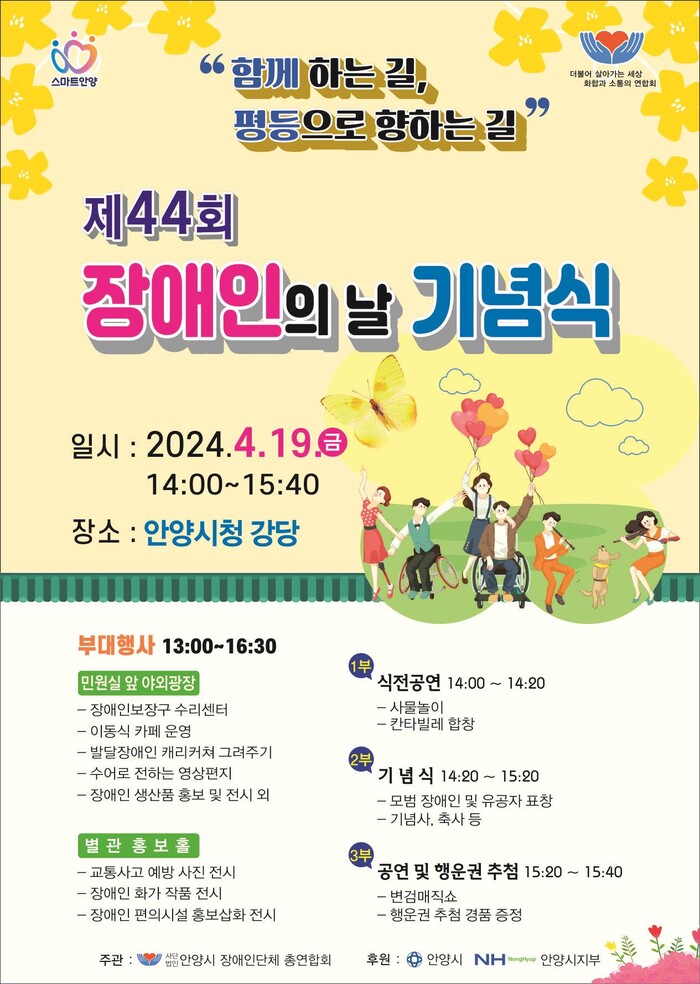 안양시는 제44회 장애인의 날(4. 20.)을 맞아 오는 19일 14시 시청 강당에서‘함께 하는 길, 평등으로 향하는 길’을 주제로 기념행사를 개최한다고 15일 밝혔다.
