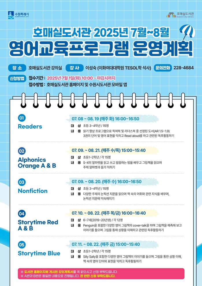 수원시 호매실도서관이 여름방학 맞아 운영하는 7~8월 영어교육 프로그램의 참가자를 모집한다.