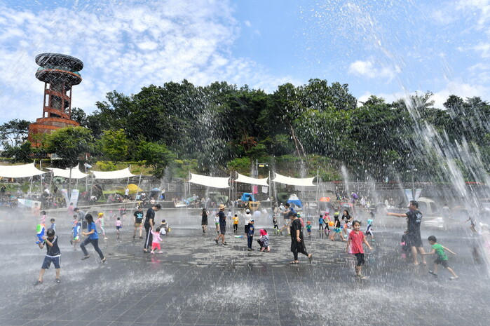 사진/ 수원시 광교호수공원 바닥분수에서 시민들이 무더위 속 물놀이를 즐기고 있다.(사진제공=수원시)