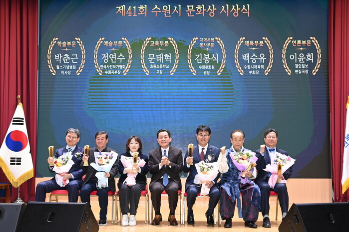 수원시(시장 이재준)가 ‘제41회 수원시 문화상’ 수상자 6명을 선정했다. 이재준 수원시장은 18일 시청 대강당에서 열린 시상식에서 수상자 6명에게 트로피를 수여했다.