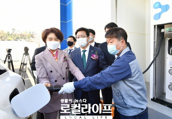| ▲ 염태영 수원시장(가운데)과 한정애 환경부장관(왼쪽)이 3월 30일 수원영통 수소충전소 준공식에서 수소차에 충전하는 모습을 보고 있다. (사진제공=수원시) |