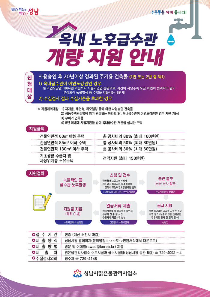 대상자는 신청서(성남시 홈페이지→분야별정보→수도→민원서식), 공사 견적서, 수질검사 성적서 또는 아연도강관 촬영 사진 등을 성남시청 5층 수도시설과에 직접 내거나 담당부서 이메일(swsd@korea.kr)로 보내면 된다.