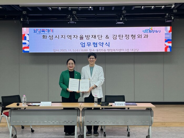 화성특례시(시장 정명근)는 지난 5일 동탄5동 행정복지센터 3층 대강당에서 화성시 지역자율방재단(단장 신상희)과 감탄정형외과(병원장 기세린)가 단원들의 건강관리와 복지 향상을 위한 업무협약(MOU)을 체결했다고 밝혔다.
