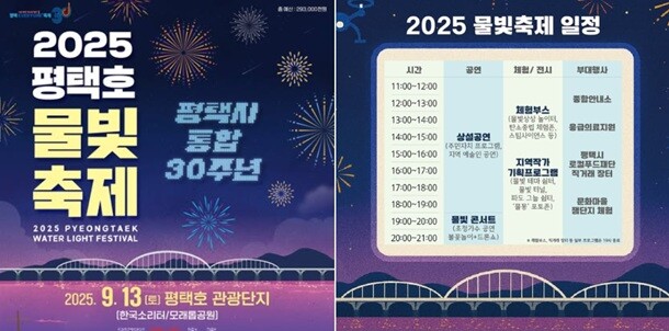 이와 관련해 정장선 평택시장은 12일, 자신의 페이스북을 통해 "2025 물빛축제가 9월 13일 평택호 일대에서 오전 11시부터 오후 9시까지 펼쳐진다"고 알렸다.
