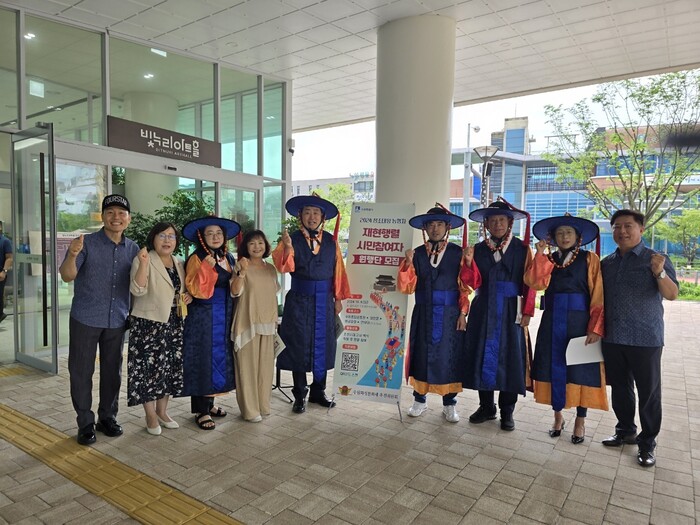사진/정찬해 수원화성문화제 공동위원장(왼쪽에서 5번째)와 위원들이 전통의상을 입고 홍보활동을 하고 있다.(사진제공=수원시)