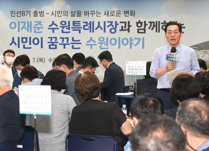 사진/이재준 시장이 장안구청에서 열린‘시민이 꿈꾸는 수원이야기(열린대화)’에서 발언하고 있다.(사진제공=수원시)