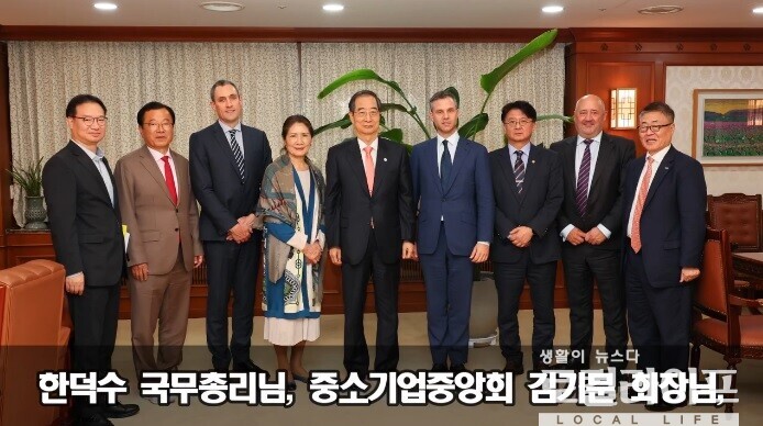 | ▲ 이현재 하남시장(왼쪽에서 두 번째)이 한덕수 국무총리(왼쪽에서 다섯 번째) 등과 기념촬영을 하고 있다. (사진출처=이현재 하남시장 페이스북 영상 갈무리) |