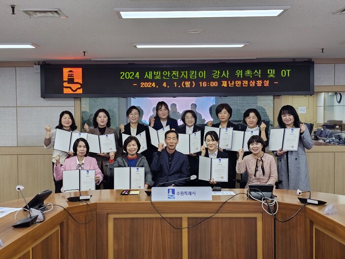 수원시(시장 이재준)는 1일 시청 재난안전상황실에서 2024년 새빛안전지킴이 교육 강사 15명에게 위촉장을 수여했다. 위촉 기간은 올해 12월 31일까지다.