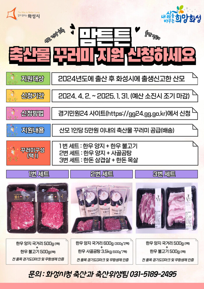 화성시(시장 정명근)가 산모의 건강 회복을 돕고 국내산 축산물 소비 촉진을 위한 ‘맘튼튼 축산물 꾸러미 지원사업’을 추진한다.