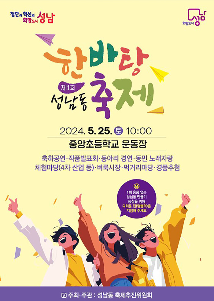 성남동 축제추진위원회에서 올해 처음 준비한 ‘성남동 한바탕 축제’ 가 오는 25일 오전 10시부터 성남중앙초등학교 운동장에서 개최된다. 남녀노소 모두가 함께 즐길 수 있는 축제가 되도록 이번 행사에서는 다양한 체험부스, 공연, 벼룩시장과 함께 먹거리를 주민들에게 저렴한 가격에 판매할 예정이다.
