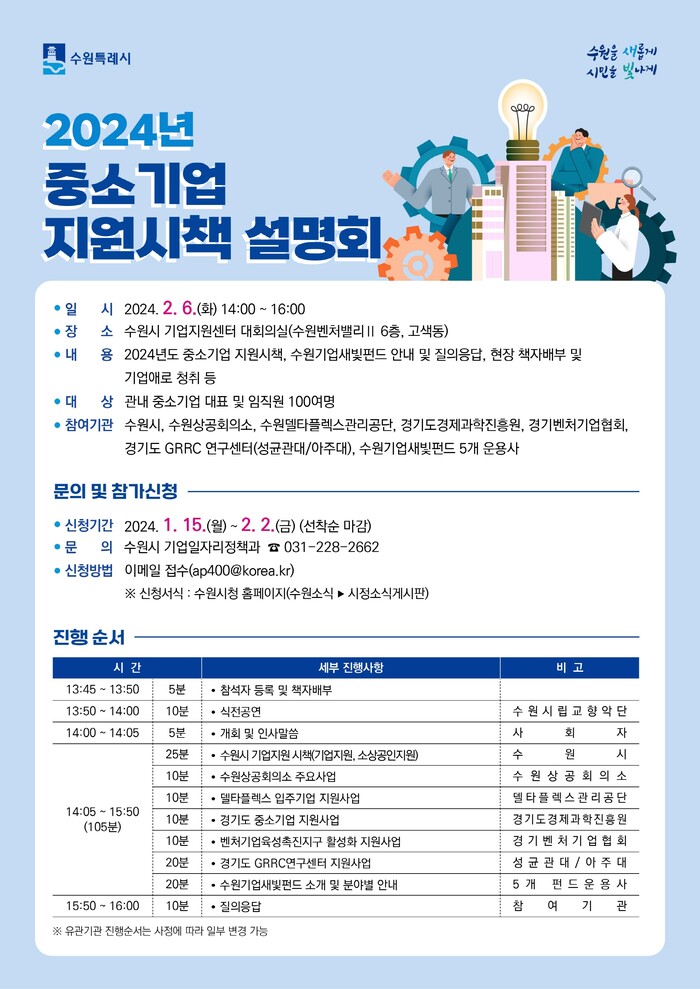 수원시가 오는 2월 6일 수원시 기업지원센터 대회의실에서 여는 ‘2024 중소기업 지원시책 설명회’에 참여할 중소기업인을 선착순으로 모집한다.