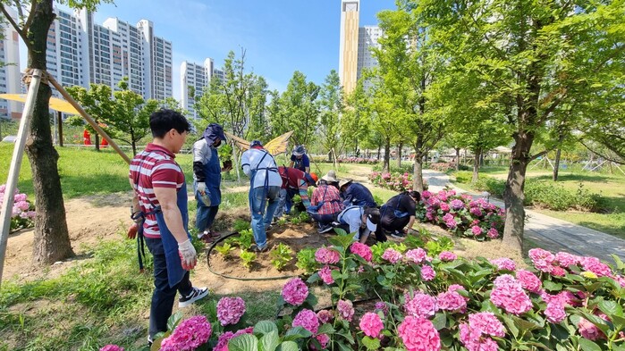 사진/새빛수원 손바닥정원단이 수국정원을 조성하고 있다.(사진제공=수원시)
