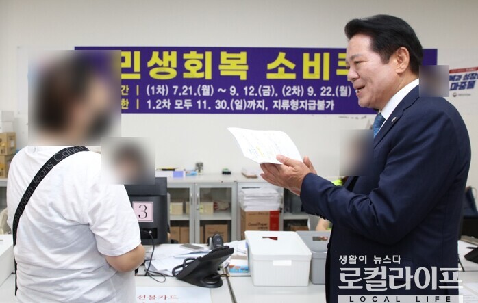 [안양=로컬라이프] 송준형 기자 = 최대호 안양시장은 23일, '민생회복 소비쿠폰' 신청과 지급이 이루어지고 있는 동 행정복지센터를 찾아 현황을 점검하고 관계자들을 격려했다.