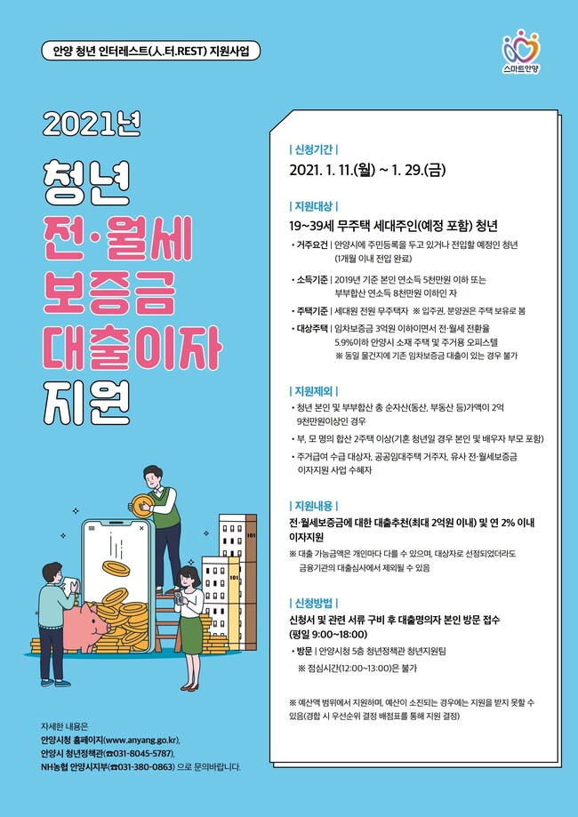 최대호 안양시장은 목돈 마련이 힘든 무주택 청년층의 전.월세보증금 대출이자를 지원해 주거비 부담을 덜어주고, 생업에 전념할 수 있게 해주기 위함이라며, 많은 신청을 권장했다.