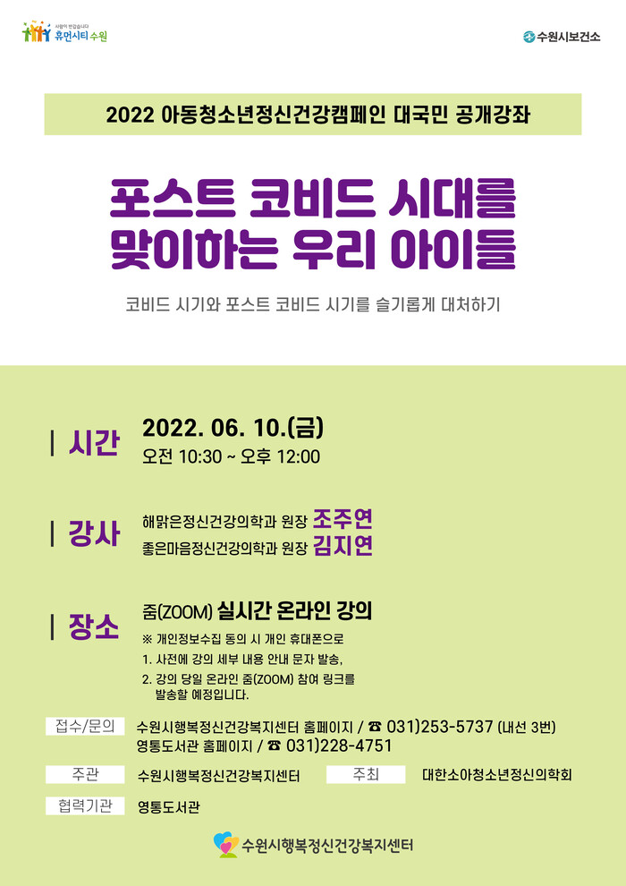 수원시행복정신건강복지센터가 온라인 강좌 ‘포스트 코비드 시대를 맞이하는 우리 아이들’에 참여할 수강생 100명을 선착순으로 모집한다.