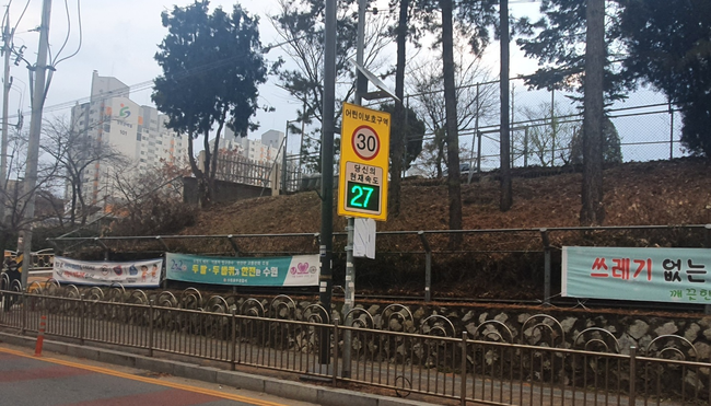 주행 차량 속도를 실시간으로 측정해 전광판에 표시해주는 과속경보시스템 표지판은 화홍·칠보·오목초교 주변 등 6개소에 설치했다. 제한속도가 30km/h인 어린이보호구역을 지나는 차량이 감속하도록 유도한다.