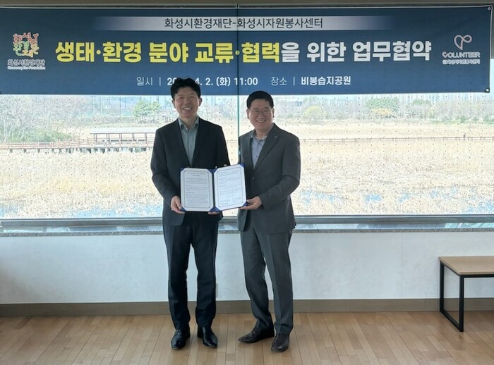 화성시환경재단(대표이사 정승호)이 화성시자원봉사센터(이사장 김세제)와 화성시 생태·환경 분야 교류 및 협력을 위한 업무 협약을 지난 2일 비봉습지공원 전망대에서 체결했다.