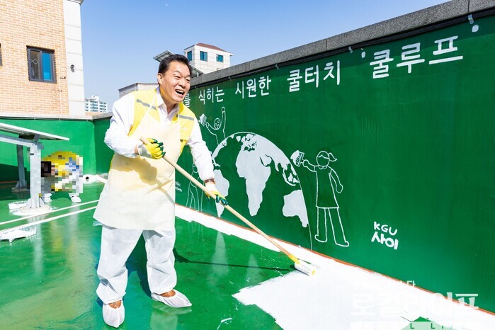 이재준 시장은 “곡반정경로당 옥상이다. 시원한 지붕 ‘쿨 루프(cool roof)’를 시공한다기에 저도 손을 조금 보태러 왔다”며 “쿨 루프는 옥상 바닥에 특수 페인트를 칠해 햇빛을 반사하고 열을 차단하는 방식이다. 옥상 표면 온도를 20도 이상 낮춰 실내 온도도 2~3도 떨어뜨린다. 냉방을 덜 하니 전기요금이 줄고 온실가스를 감축하는 효과도 적지 않다”고 밝혔다.