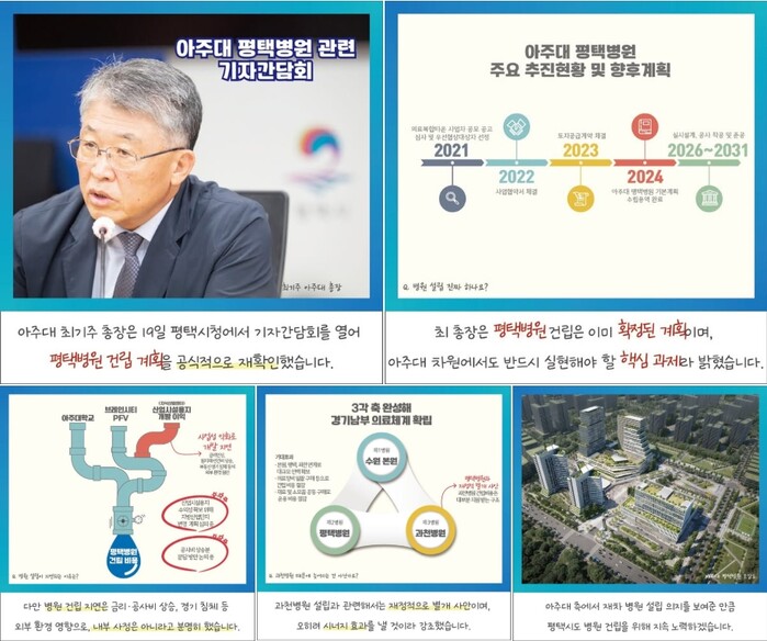 이어 “아주대 측은 평택병원이 구체적이고 실질적으로 추진되고 있다고 설명했다”며 “평택병원은 제2병원, 과천병원은 제3병원으로 경쟁이 아닌 시너지 효과를 강조했고, 과천병원 건립 비용은 대부분 지원받는 구조라 평택병원 건립에는 아무 영향이 없다는 점도 다시 한 번 밝혔다”고 전했다.