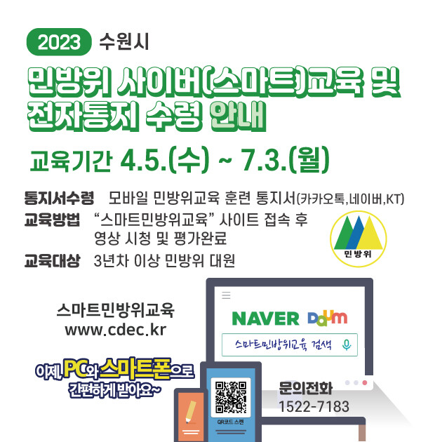 수원시가 4월 5일부터 7월 3일까지 ‘2023년 민방위 사이버 교육’을 운영한다.