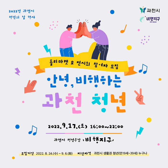 과천시가 ‘청년의 날’인 9월 17일에 ‘안녕, 비행하는 과천 청년’이라는 주제로 청년공간 비행지구에서 기념 행사를 여는 가운데, 이날 행사에서 진행되는 청년마켓 판매(6팀) 및 사진전(10작품)에 참여할 청년을 내달 6일까지 모집한다고 25일 밝혔다.