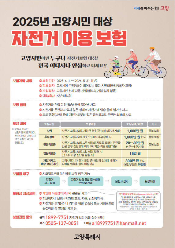 이동환 고양특례시장은 “시민 모두가 안심하고 자전거를 이용할 수 있도록 매년 자전거 이용보험을 지원하고 있다” 며 “자전거 사고를 당했을 때 실질적인 도움이 될 수 있도록 적극적으로 운영해 나가겠다”고 전했다.