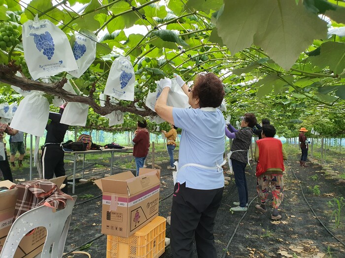 수원시농업기술센터가 육성하는 생활개선수원시연합회가 권선구 구운동 포도재배 농가에 일손돕기 자원봉사를 했다.