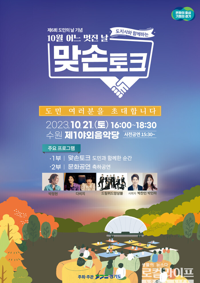 [경기=로컬라이프] 송준형 기자 = “10월 어느 멋진 날, 도지사와 함께하는 맞손토크”가 10월 21일 오후 4시부터 6시 30분까지 수원 제1야외음악당에서 개최된다. 사전공연은 오후 3시 30분부터 진행된다.