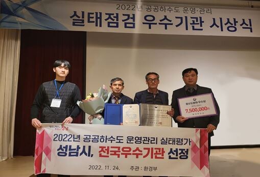 성남시는 환경부가 4개 그룹(인구수 별)으로 나누어 시행한 ‘2022년 공공 하수도 운영·관리 실태평가’에서 Ⅰ그룹(인구 30만 이상)에서 2년 연속 우수기관으로 선정돼 인증패와 750만원의 포상금을 받았다고 25일 밝혔다.