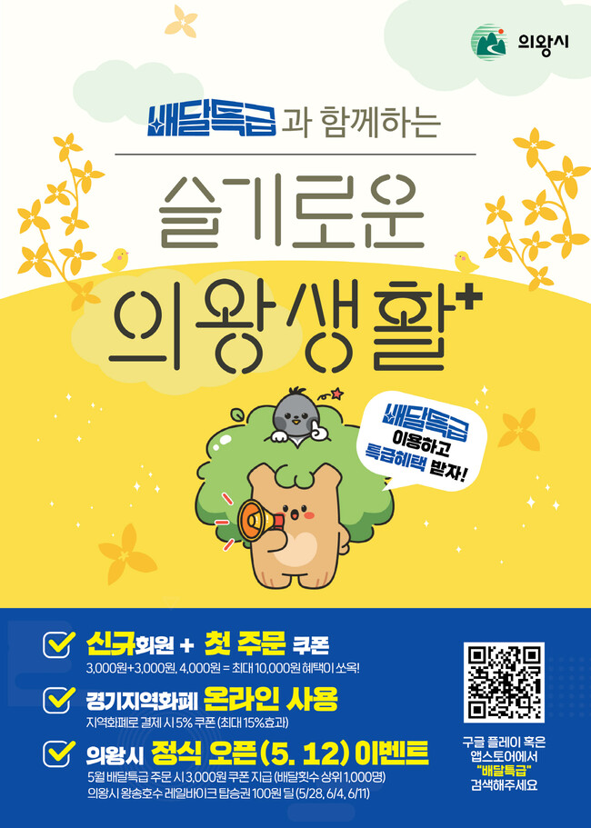 특히, 기존 민간 배달앱과 달리 지역화폐 결제가 가능하며, 의왕사랑상품권 사용 시 지역화폐 충전에 따른 10% 선 할인과 함께 5% 할인쿠폰을 적용할 수 있어 최대 15% 할인을 받을 수 있다.