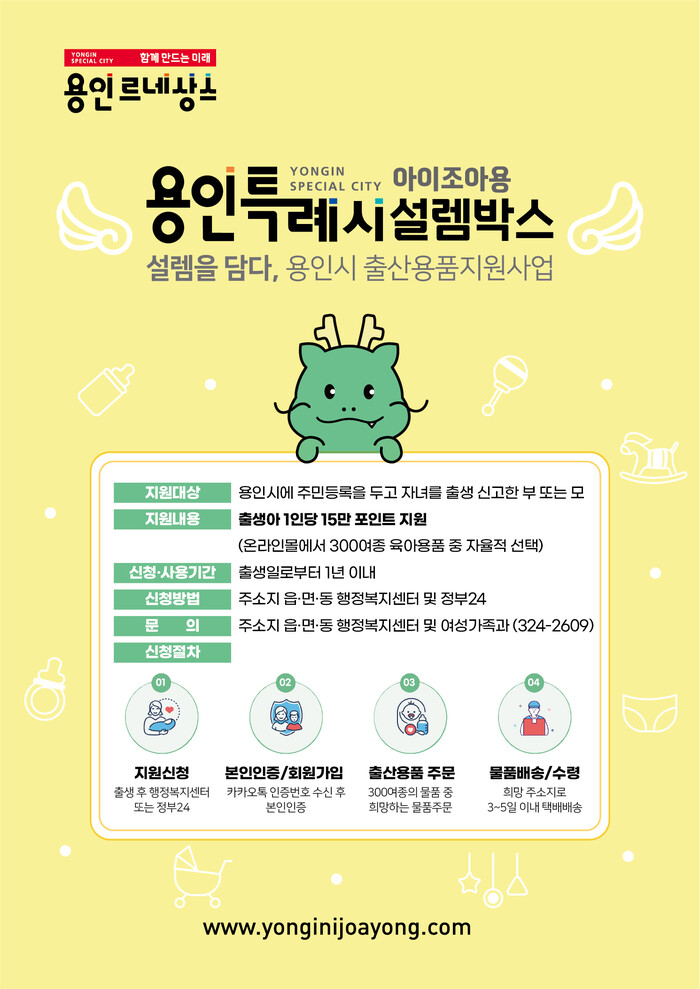 지원 대상은 출생일로부터 1년 이내 용인특례시에 출생신고를 한 시민이며, 읍‧면‧동 행정복지센터를 방문하거나 정부24(www.gov.kr.) 홈페이지에서 신청할 수 있다.