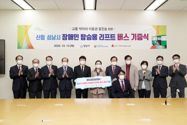 성남시는 10월 13일 오후 2시 시청 2층 회의실에서 은수미 성남시장과 김윤식 신협사회공헌재단 이사장, 최은숙 경기사회복지공동모금회 사무처장 등이 참석한 가운데 ‘신협 성남시 장애인 탑승용 리프트 버스 2대 기증식’을 했다.