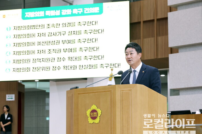 이어 "온전한 권한이 없으면 1420만 도민의 뜻을 온전히 대변할 수 없고, 국회가 '국회법'으로 독립성을 보장받듯이 지방의회도 '지방의회법' 제정으로 온전한 위상을 가져야 한다"라며 "오늘 우리의 외침과 단단한 결의가 대한민국 지방자치의 흐름을 바꾸는 강한 울림이 되길 희망한다"고 기대했다.