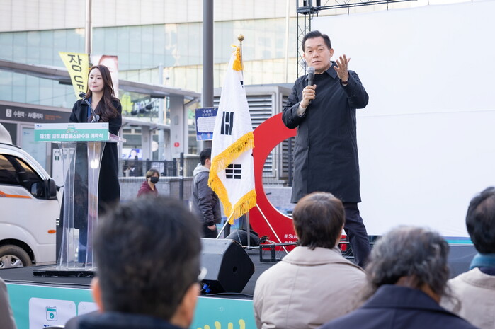 이재준 수원특례시장이 12일 매산로테마거리에서 열린 ‘제2회 새빛세일페스타, 수원’ 개막식에서 “새빛세일페스타가 수원시 경제 주체와 시민들 모두가 즐길 수 있는 행사로 자리 잡도록, 봄·가을 새빛세일페스타를 정례화하겠다”고 말했다.