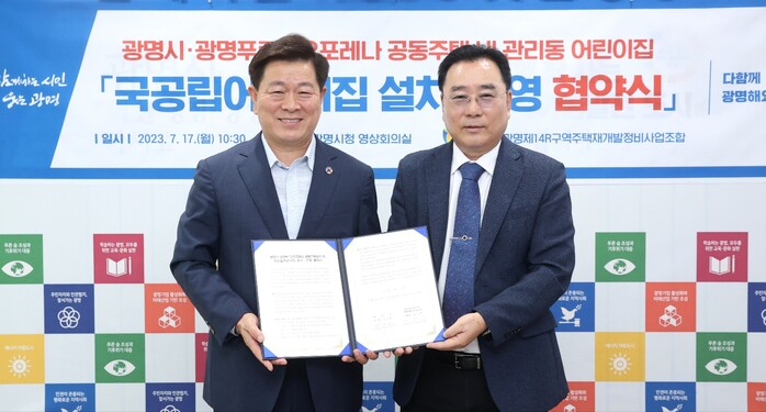 광명시(시장 박승원)는 17일 오전 시청 영상회의실에서 광명제14R구역주택재개발정비사업조합(조합장 이승희)과 광명푸르지오포레나 단지 내 국공립어린이집 설치.운영 협약을 체결했다.