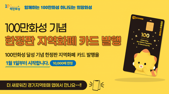 화성시(시장 정명근)가 화성시 인구 100만 명 돌파를 축하하는 의미를 담아 오는 1월 1일부터 10,000매 한정 ‘100만 화성 기념 희망화성지역화폐 카드’를 발행한다.