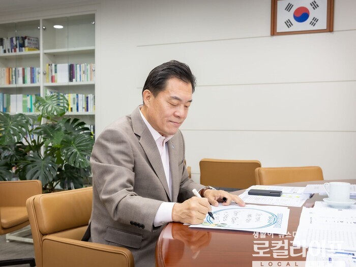 | ▲ 이재준 수원특례시장이 수험생들에게 전하는 응원의 메시지를 적고 있다. (사진출처=이재준 페이스북) |