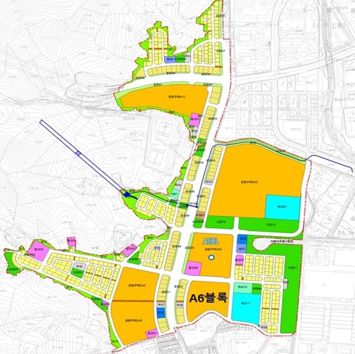 구름산지구 A6블록은 부지면적 2만4천267㎡(7천340평)로 건폐율 30%, 용적률 180%의 445세대 공동주택용지이다.