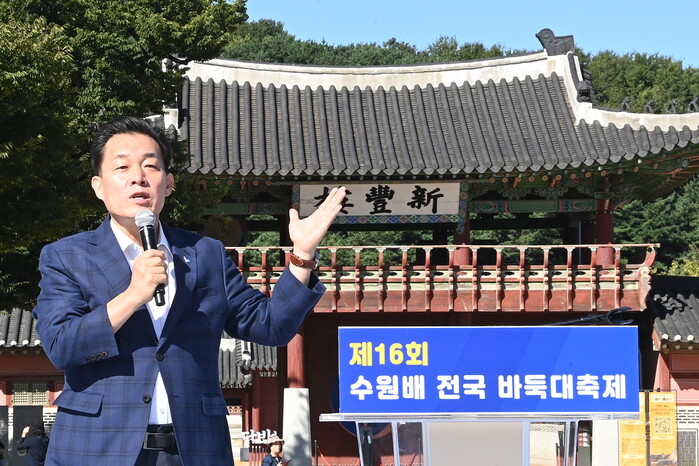24일 행궁광장에서 열린 제16회 수원배 전국 바둑대축제에서 기념사를 한 이재준 시장은 “오늘 승부를 떠나 ‘한수 배웠다’라는 바둑 본연의 의미를 되새기고, 가을이 풍성한 수원에서 좋은 추억을 남기길 바란다”고 밝혔다.