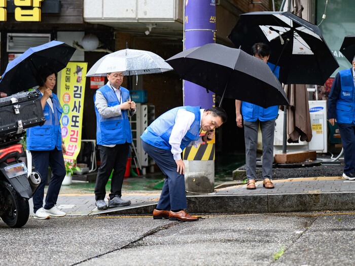 이재준 수원시장이 4일 오전 곡선동 민원 현장에서 ‘새빛 현장시장실’을 열고, 민원이 발생한 도로의 요철을 자세히 살펴봤다. 또 박병기씨와 곡선동 주민자치회장, 통장협의회장 등 주민들을 만나 이야기를 나눴다.