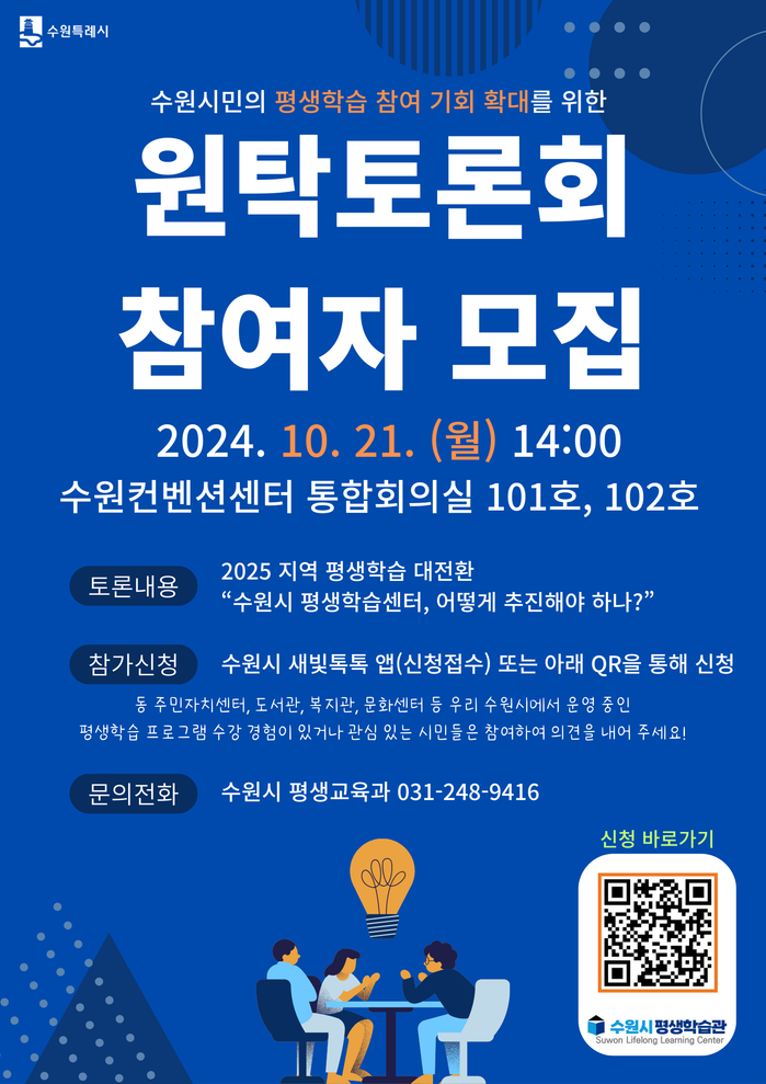 수원시(시장 이재준)는 ‘수원시민의 평생학습 참여 기회 확대를 위한 원탁토론회’에 참여할 시민 100명을 10월 18일까지 모집한다.