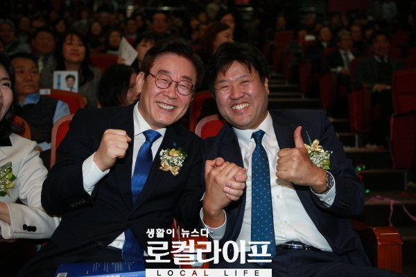 | ▲ 이재명 경기도지사는 김용 전 경기도 대변인의 출판기념회에 참석해 “김용은 뜻을 함께하는 벗이자 분신 같은 사람이다”라고 말했다. 사진은 출판기념회에서 함께 다정한 모습을 보이는 이재명 경기도지사(왼쪽)와 김용 전 경기도 대변인(오른쪽). (사진제공=김용) |