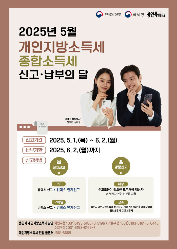 용인특례시(시장 이상일)는 시민들이 편리하게 개인지방소득세를 신고·납부 할 수 있도록 5월 한 달간 기흥구청 지하 1층 세미나실1에서 ‘개인지방소득세 신고창구’를 운영한다고 1일 밝혔다.