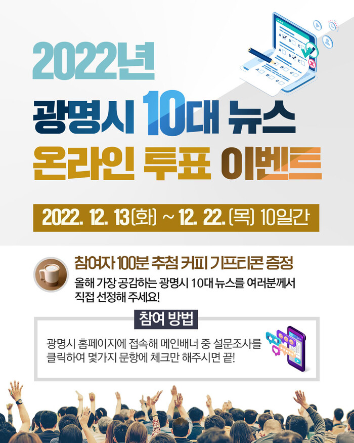 광명시(시장 박승원)는 12월 13일부터 22일까지 ‘2022년 광명시 10대 뉴스’ 시민 온라인 투표를 진행한다.