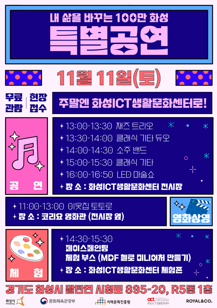 자세한 사항은 화성ICT생활문화센터 홈페이지에서 확인할 수 있으며, 공연 및 체험활동은 별도 예약없이 관람 및 체험이 가능하다.