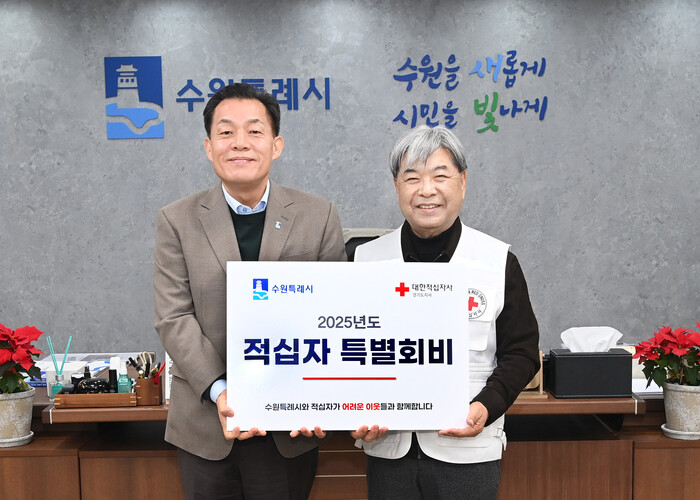 수원시(시장 이재준)가 대한적십자사 경기도지사에 ‘2025년 특별회비’ 500만 원을 전달했다. 전달식은 16일 이재준 수원시장 집무실에서 열렸다.